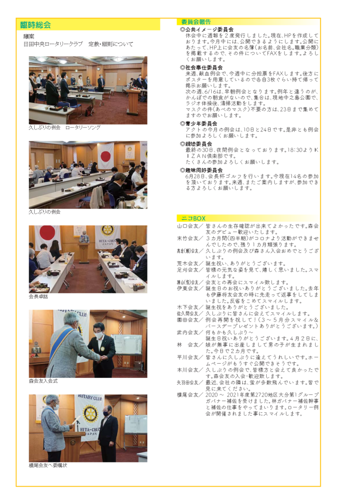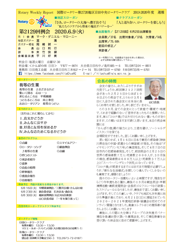 例会報告 第2129回例会 2020.6.9(火) Tweet 2020.06.09 by hitachuo-higuma 0 最近の投稿 第2316回例会(2026年1月20日) 会員卓話 後藤信寛会友 第2315回例会(2026年1月6日) 新春夜間例会 あけましておめでとうございます。 第2314回例会(2025年12月23日)会長卓話「半期を振り返って」 第2313回例会(2025年12月9日) クラブフォーラム