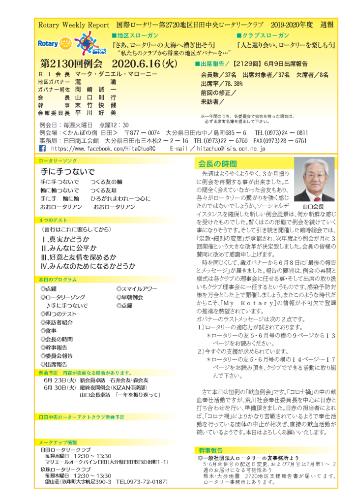 例会報告 第2130回例会 2020.6.16(火) Tweet 2020.06.16 by hitachuo-higuma 0 最近の投稿 第2316回例会(2026年1月20日) 会員卓話 後藤信寛会友 第2315回例会(2026年1月6日) 新春夜間例会 あけましておめでとうございます。 第2314回例会(2025年12月23日)会長卓話「半期を振り返って」 第2313回例会(2025年12月9日) クラブフォーラム