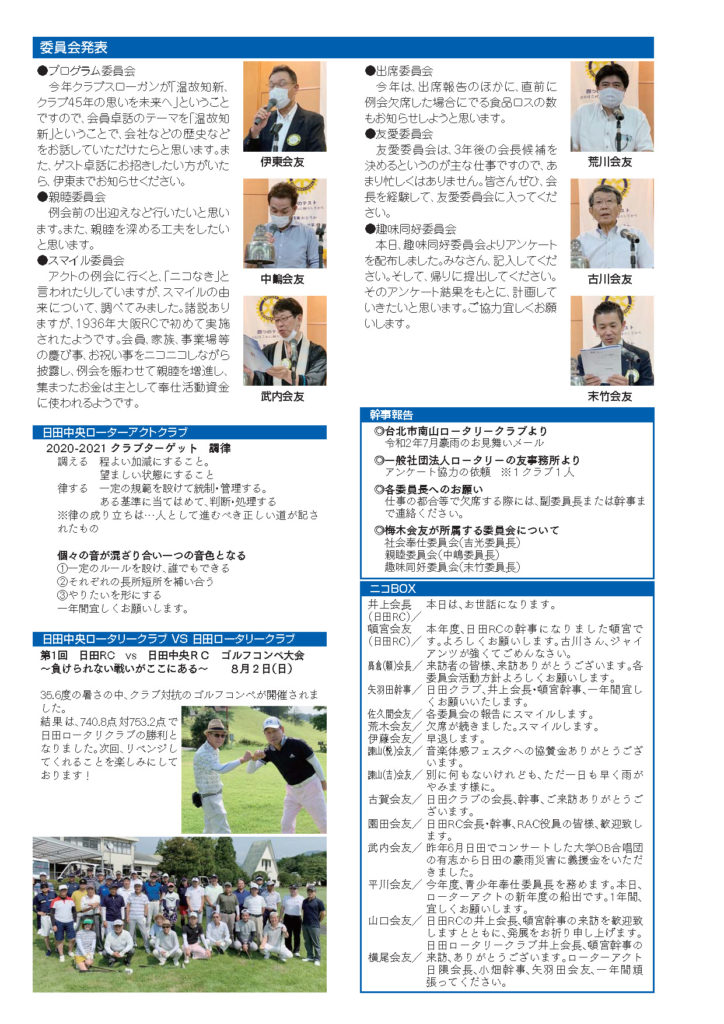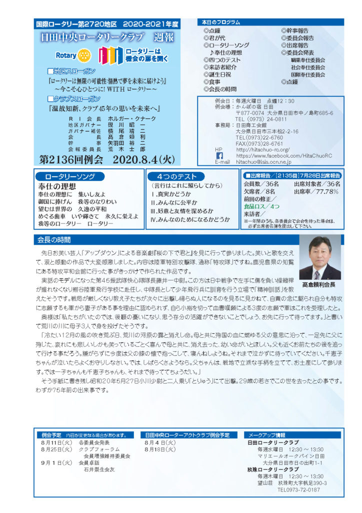 例会報告 第2136回 2020.8.4(火) Tweet 2020.08.04 by hitachuo-higuma 0 最近の投稿 第2316回例会(2026年1月20日) 会員卓話 後藤信寛会友 第2315回例会(2026年1月6日) 新春夜間例会 あけましておめでとうございます。 第2314回例会(2025年12月23日)会長卓話「半期を振り返って」 第2313回例会(2025年12月9日) クラブフォーラム