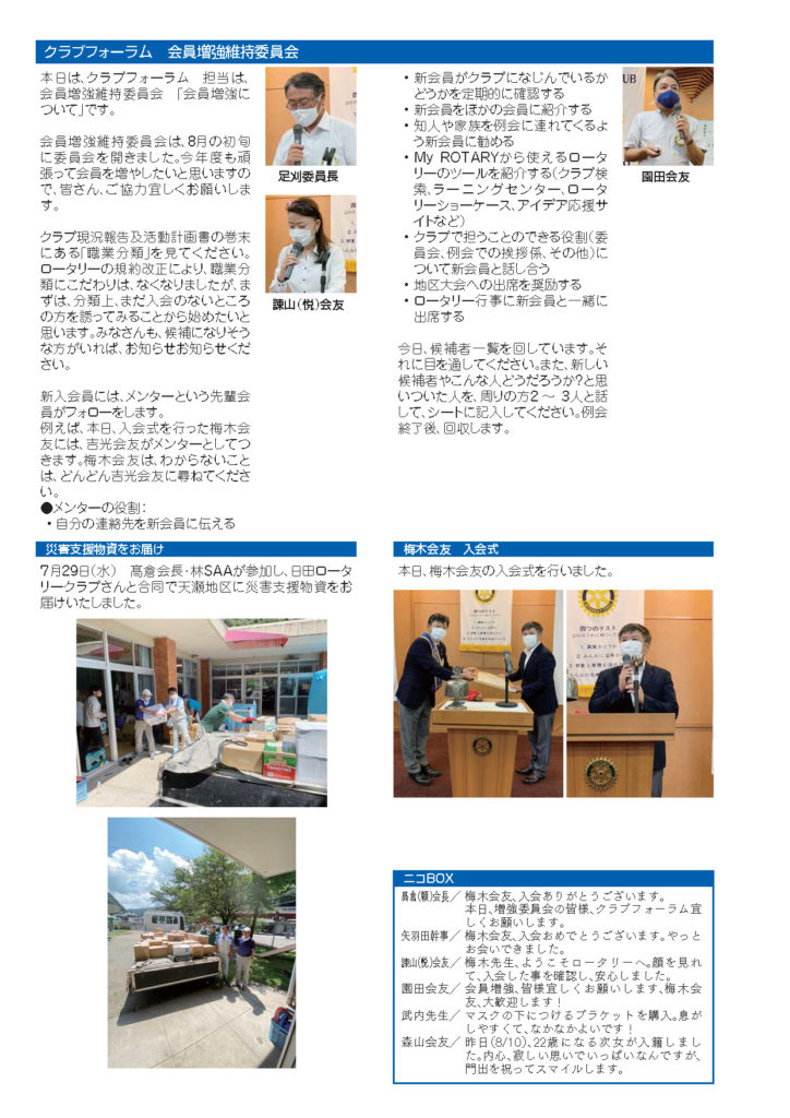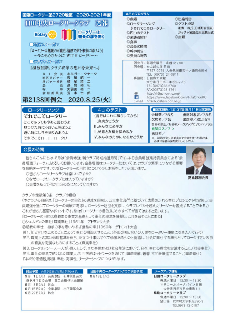 例会報告 第2138回 2020.8.25(火) Tweet 2020.08.25 by hitachuo-higuma 0 最近の投稿 第2316回例会(2026年1月20日) 会員卓話 後藤信寛会友 第2315回例会(2026年1月6日) 新春夜間例会 あけましておめでとうございます。 第2314回例会(2025年12月23日)会長卓話「半期を振り返って」 第2313回例会(2025年12月9日) クラブフォーラム