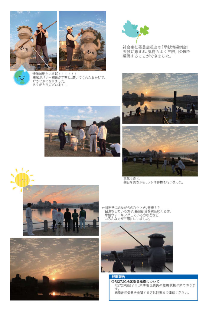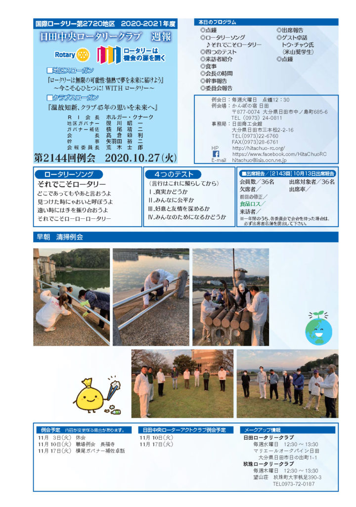 例会報告 第2144回 2020.10.27(火) Tweet 2020.10.27 by hitachuo-higuma 0 最近の投稿 第2316回例会(2026年1月20日) 会員卓話 後藤信寛会友 第2315回例会(2026年1月6日) 新春夜間例会 あけましておめでとうございます。 第2314回例会(2025年12月23日)会長卓話「半期を振り返って」 第2313回例会(2025年12月9日) クラブフォーラム