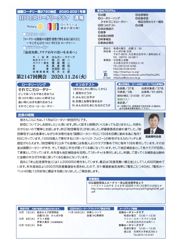 例会報告 第2147回 2020.11.24(火) Tweet 2020.11.24 by hitachuo-higuma 0 最近の投稿 第2316回例会(2026年1月20日) 会員卓話 後藤信寛会友 第2315回例会(2026年1月6日) 新春夜間例会 あけましておめでとうございます。 第2314回例会(2025年12月23日)会長卓話「半期を振り返って」 第2313回例会(2025年12月9日) クラブフォーラム