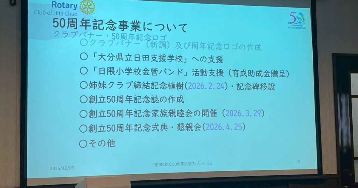 日田中央ロータリークラブは本年創立50周年を迎えます。
