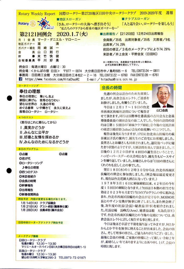 例会報告 第2121回例会 2020.1.7(火) Tweet 2020.01.07 by hitachuo-higuma 0 最近の投稿 第2316回例会(2026年1月20日) 会員卓話 後藤信寛会友 第2315回例会(2026年1月6日) 新春夜間例会 あけましておめでとうございます。 第2314回例会(2025年12月23日)会長卓話「半期を振り返って」 第2313回例会(2025年12月9日) クラブフォーラム
