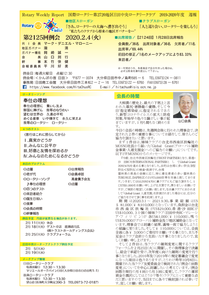 例会報告 第2125例会 2020.2.4(火) Tweet 2020.02.04 by hitachuo-higuma 0 最近の投稿 第2316回例会(2026年1月20日) 会員卓話 後藤信寛会友 第2315回例会(2026年1月6日) 新春夜間例会 あけましておめでとうございます。 第2314回例会(2025年12月23日)会長卓話「半期を振り返って」 第2313回例会(2025年12月9日) クラブフォーラム
