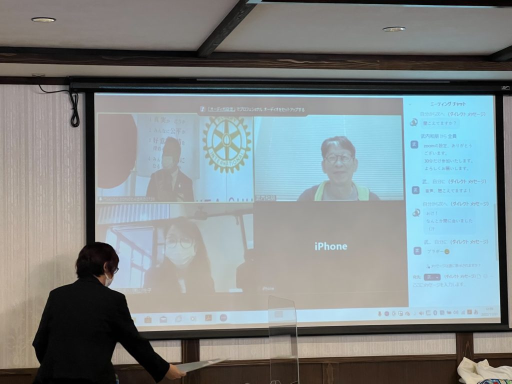 さらに、今月よりハイブリッドによる例会開催がスタートしました。今回は、武内会友・山口雄士会友がオンラインにて参加。今後は、姉妹クラブや友好クラブとオンラインによる例会も開催が可能となります。