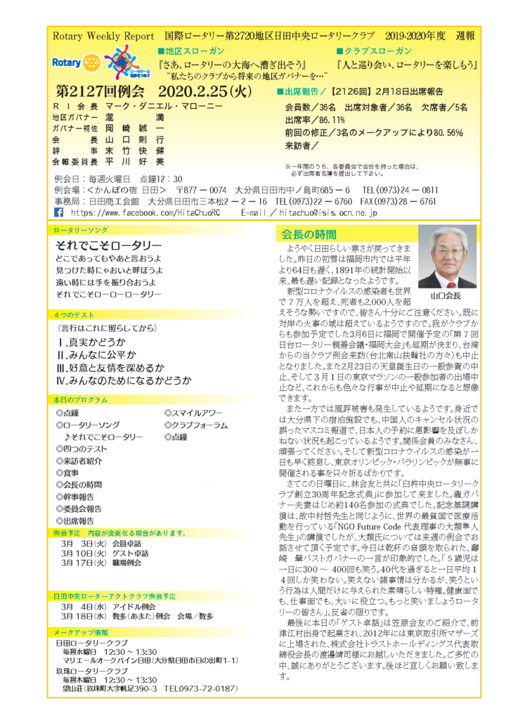 例会報告 第2127回例会 2020.2.25(火) Tweet 2020.02.25 by hitachuo-higuma 0 最近の投稿 第2316回例会(2026年1月20日) 会員卓話 後藤信寛会友 第2315回例会(2026年1月6日) 新春夜間例会 あけましておめでとうございます。 第2314回例会(2025年12月23日)会長卓話「半期を振り返って」 第2313回例会(2025年12月9日) クラブフォーラム